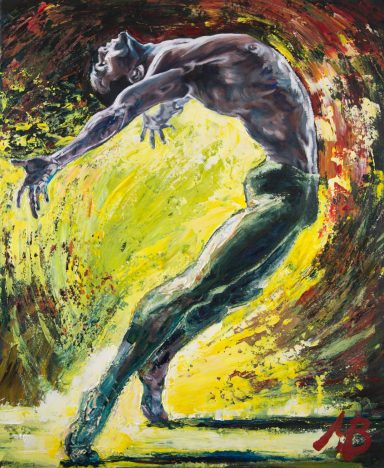 He blends influences from music, fashion, dance, and nature into bold, textured paintings.